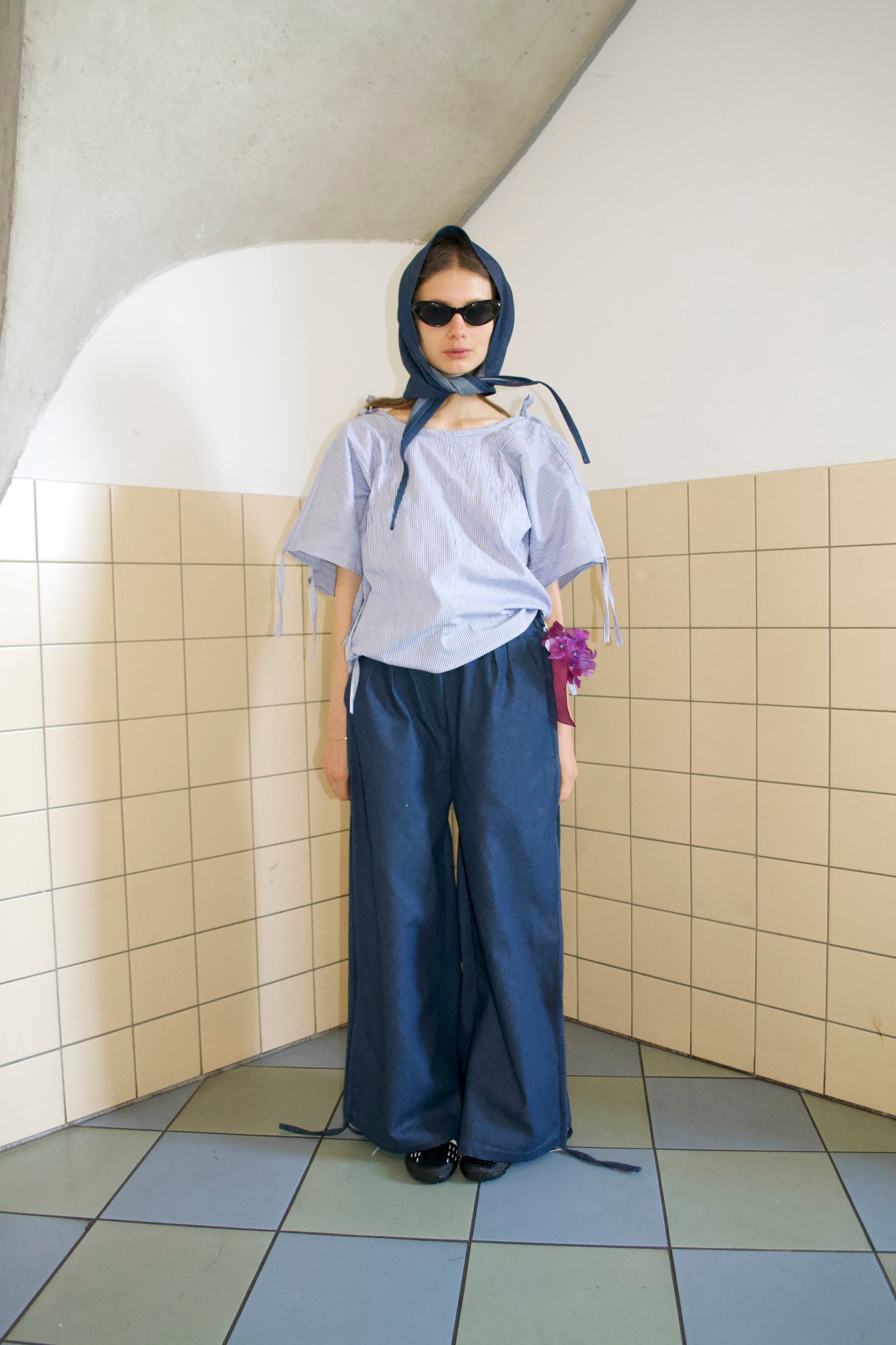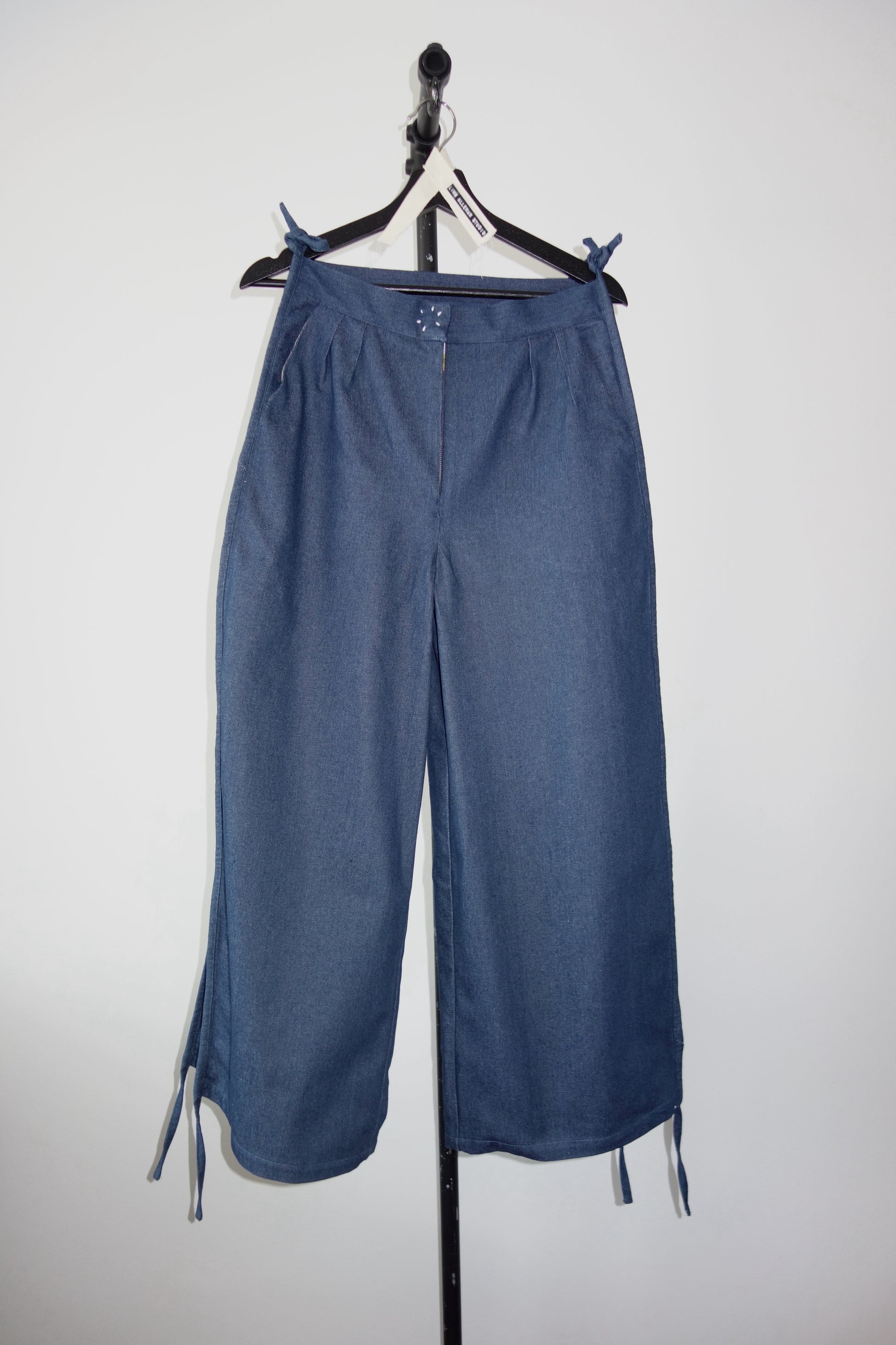 The Ma jeans in washed blue denim. Can be made bigger and smaller by playing with the ribbons.
