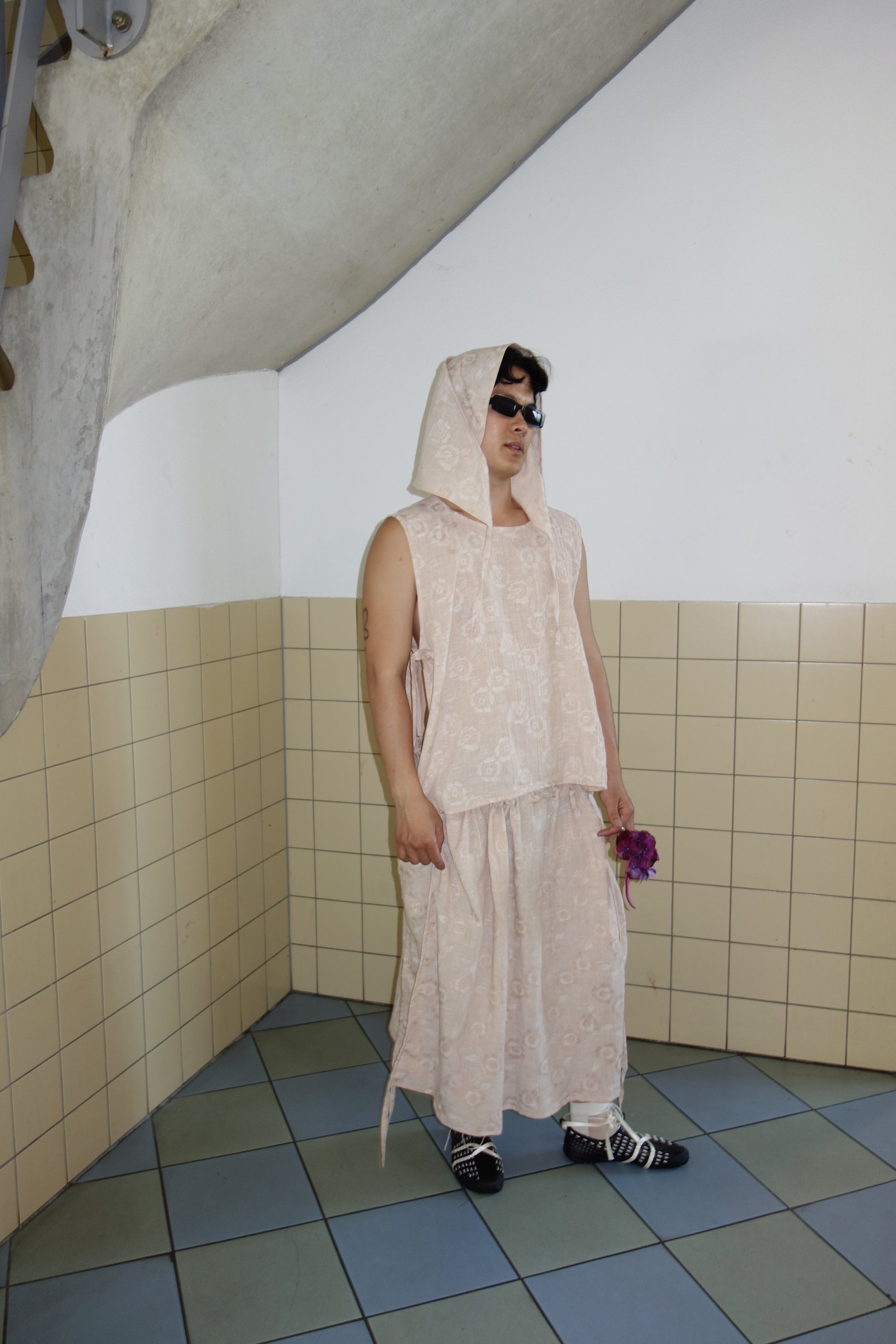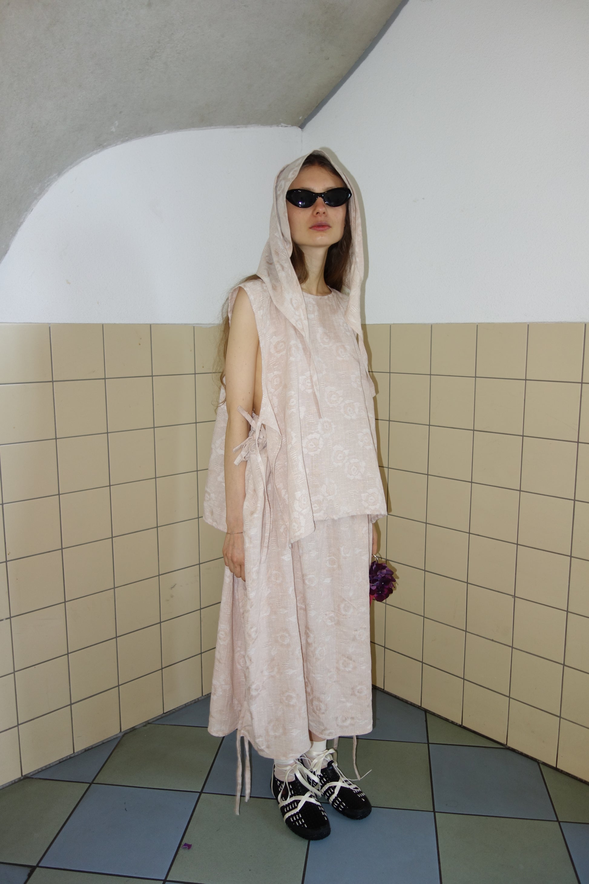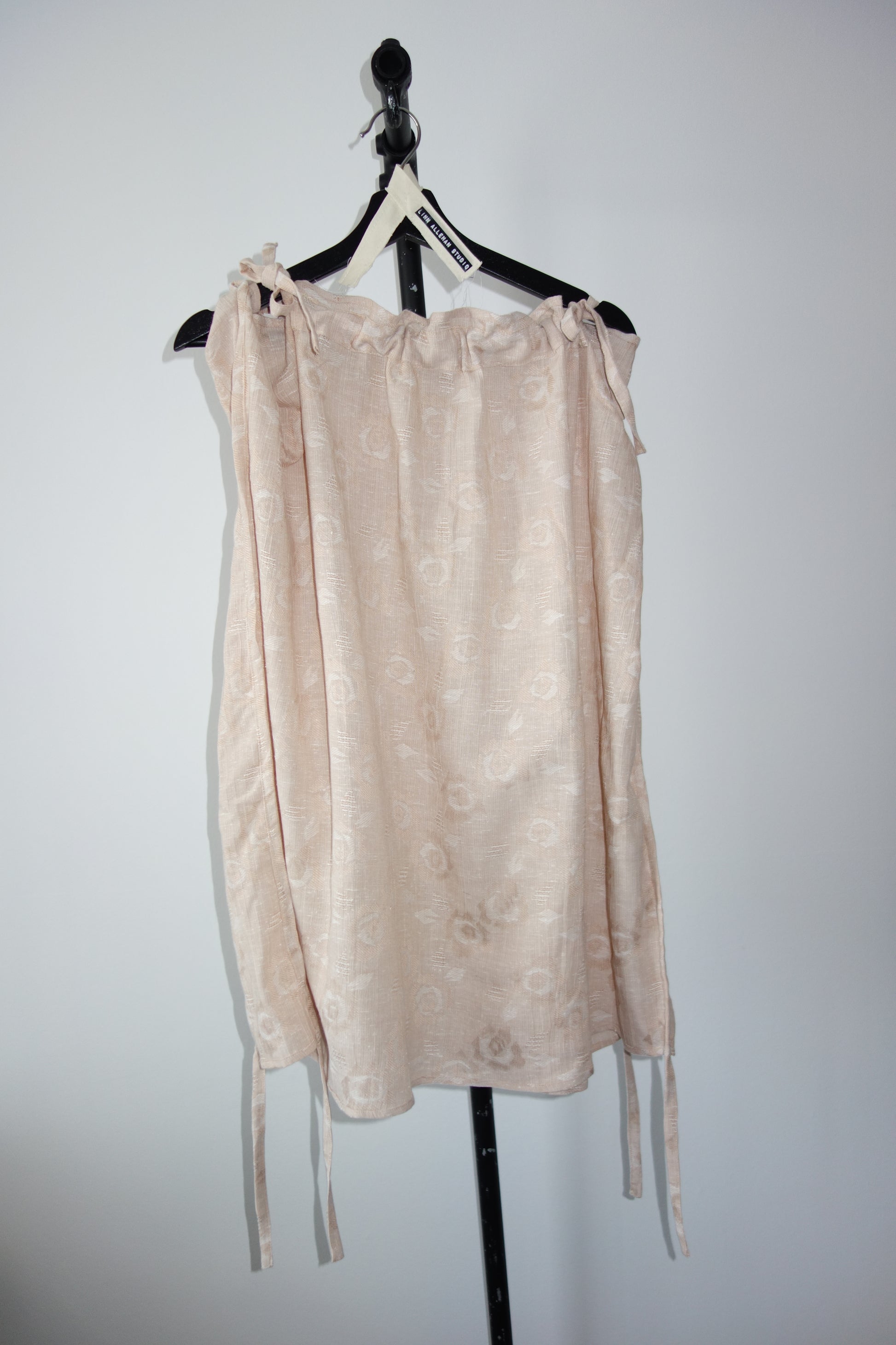 The Lu ribbon skirt in a floral pattern made out of linnen and cotton. Light fabric with special weave pattern. Can be gathered at the waist to change the size.